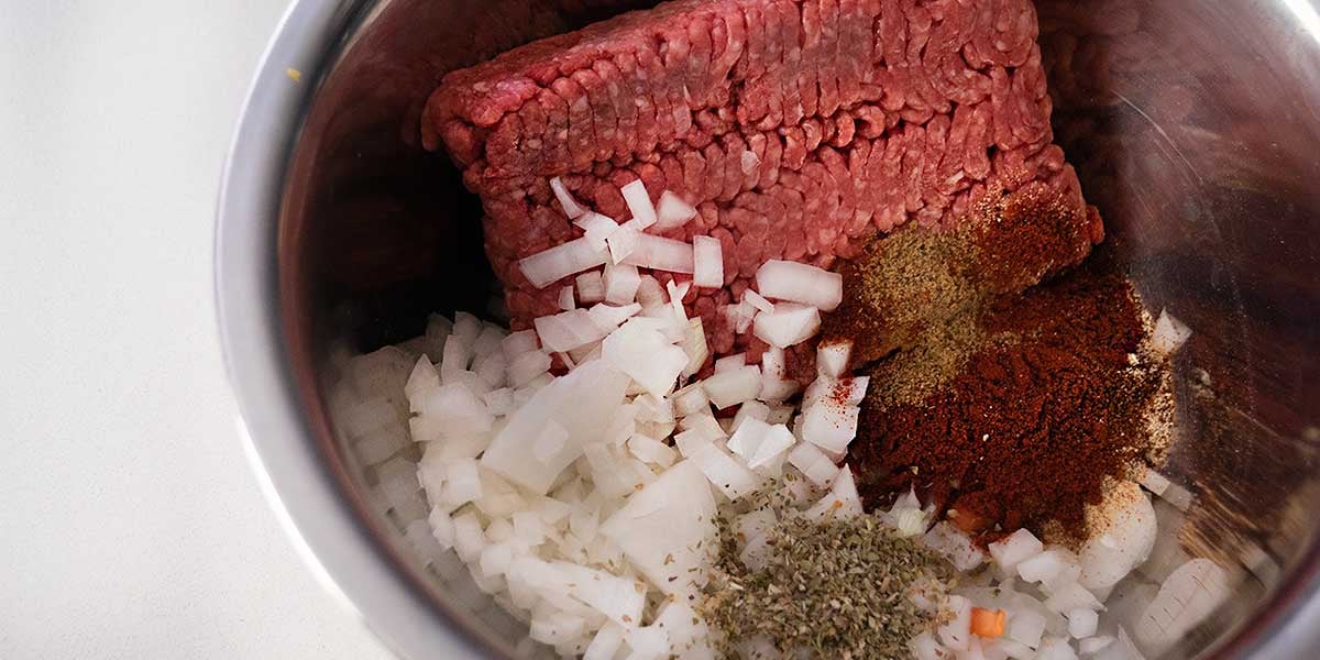 Mix your ground raw meat with the taco seasoning, stock, and chopped onion, feel free to add any other seasonings you'd like such as onion powder, or add fresh herbs like chopped cilantro or parsley.