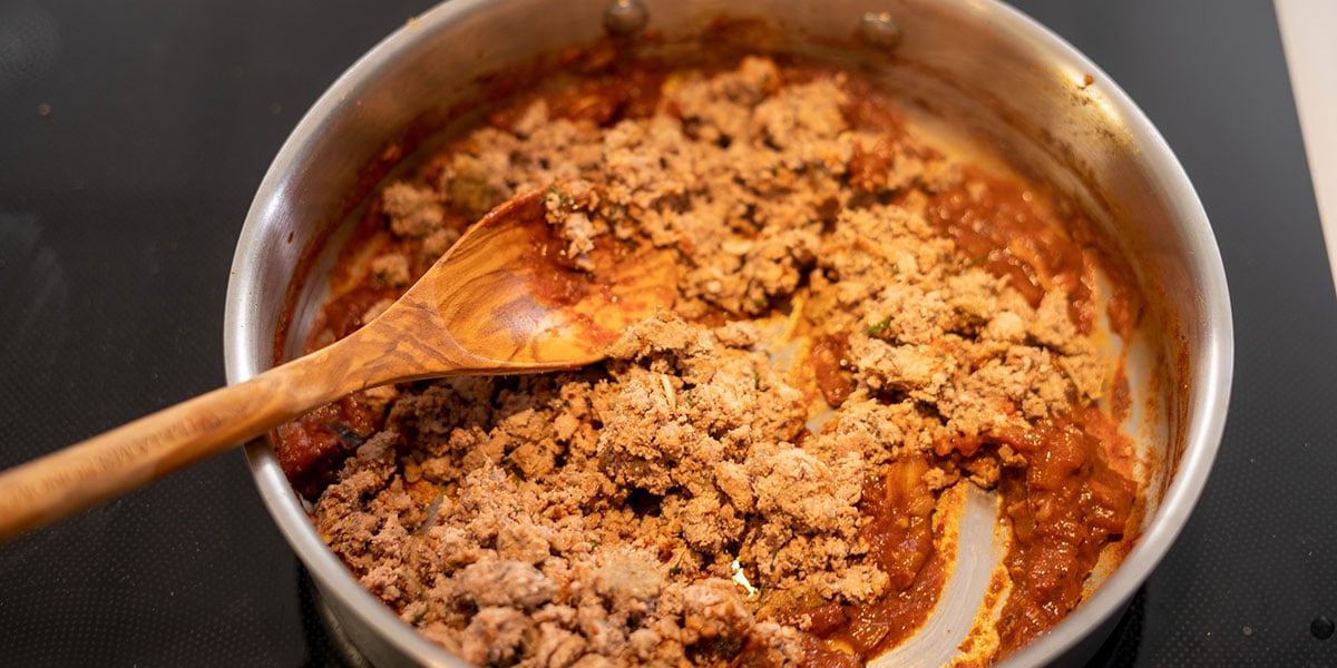 Immediately after, add ground beef and mix to fully incorporate the aromatic-spice mixture. Increase the heat to medium-high and begin cooking the ground meat. Stir and scrape any brown bits.