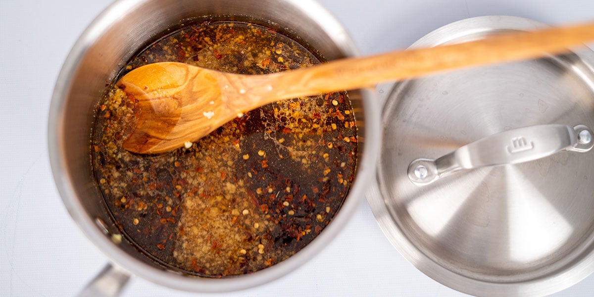 In a small saucepan, combine sesame oil, avocado oil, chicken broth, coconut aminos, lime juice, fresh ginger, honey garlic powder and red pepper flakes. Bring to a boil, mixing often and then reduce heat to medium to an active simmer.