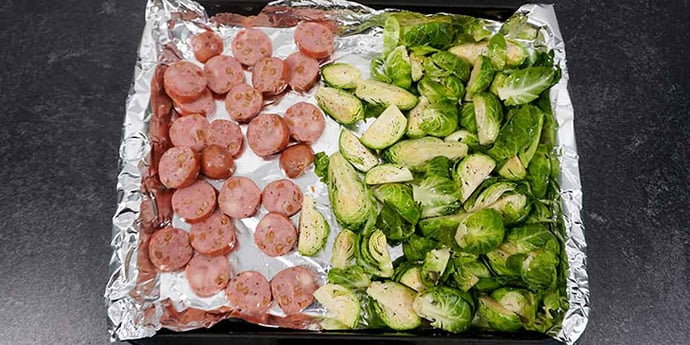 Slice the sausages in circles and add these to the same sheet pan as the one you will use to cook the Brussels sprouts. Keep the sausage and the Brussels sprouts separated but evenly distributed.