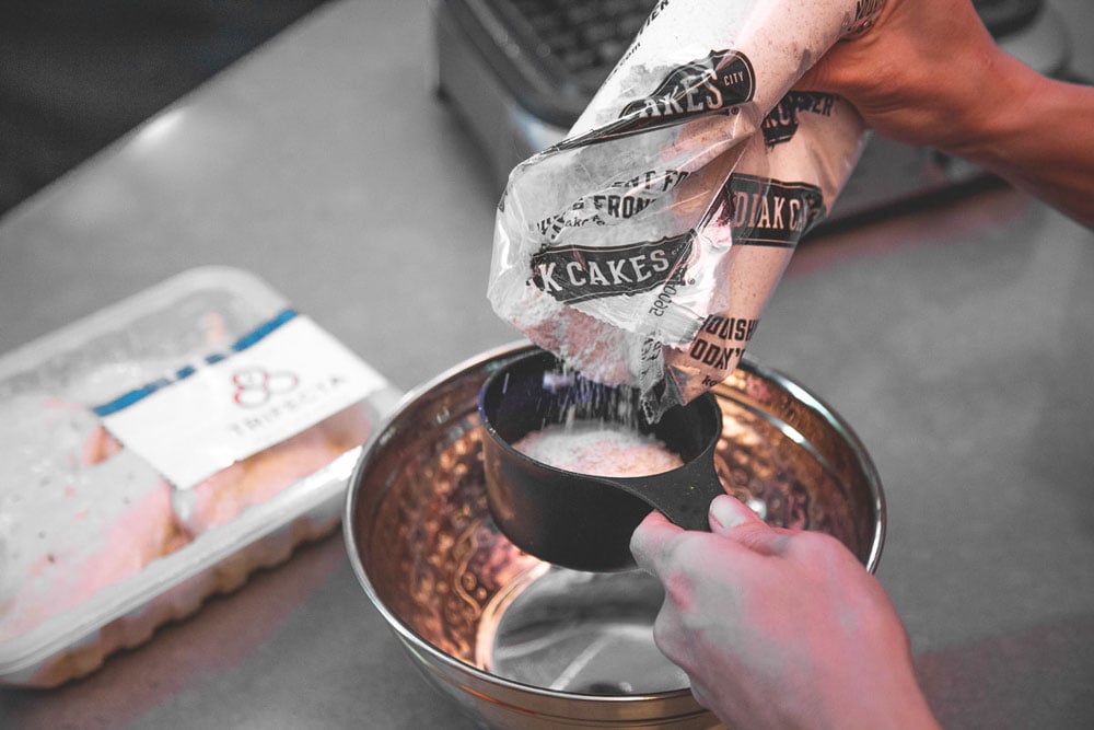 Add the remaining batter to pre-heated waffle iron and cook through. One cup of mix should be enough to make two medium-sized waffles and one piece of battered chicken.