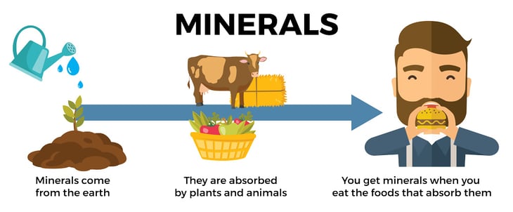 Minerals, on the other hand, are inorganic, meaning they are found in soil and water and are not produced by living organisms like vitamins. Because minerals are not easily destroyed by the elements, they can be transported from soil and water into plants and animals, and then later absorbed by you without losing their structure. This also means they don’t change form once you absorb them.